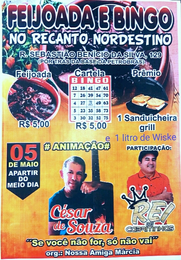 HOJE NO RECANTO NORDESTINO NO BAIRRO BOM JESUS TEM FEIJOADA, MÚSICA BOA E UM BINGO.